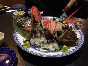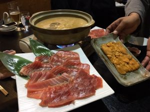 中でも、ここの名物は鮪に雲丹を包んでのしゃぶしゃぶです。脂がのったマグロに雲丹を挟んでしゃぶしゃぶすると、ほっぺたが落ちそうになります。また、金目鯛のお造りも美味です。
